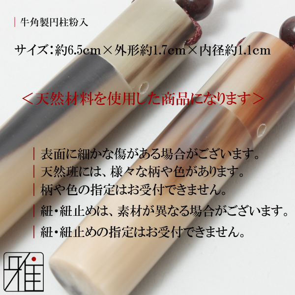 TOP かけ付属品|Yugake Accessories かけ付属品|Yugake Accessoriesぎり粉・粉入・その他 弓道 弓がけ ぎり粉入れ | 牛角製円柱【メール便可】 価格: ¥3,960 (税込) 販売期間: 型番: 332211 数量: 個 在庫: 29個 在庫 29個 返品・交換についての詳細はこちら レビューはありません 商品仕様 製品名: 弓道 弓がけ ぎり粉入れ | 牛角製円柱|翠山弓具店 suizan kyugu 型番: 332211 |ぎり粉入れ ぎり粉を入れ、保管持ち運び用として使用いたします。 |ぎり粉とは 弓がけ使用する、滑り止め用の粉を“ぎり粉”と呼びます。 名称の由来は、ぎり粉をつけて弓を引いてくると、ギリギリと音がすることから“ぎり粉と呼ばれるようになりました。 ぎり粉の原材料としては、松脂を数時間から半日ほど煮込み油分を飛ばしたものを冷やして固形となったものをすり潰して粉状になったものを使用します。 三つかけの方は、中指のとりかけをする位置に適量ぎり粉入れから出し、親指で擦り合わせいたします。 |使用量・使用頻度 ぎり粉の使用量は、弓かけの状態により変化します。 新品の頃は、比較的使用頻度は高く、マメにつけることが好ましいですが、ある程度 弓かけにぎり粉が馴染んできたら、できるだけ頻度は少なくしていくことが好ましいです。 ぎり粉の量は、ぎり粉入れから一振り二振り程度の量が好ましいです。 あまり使用量や使用頻度が高くなってしまうと、弓かけの汚れのもとになりやすいです。 【商品詳細】 弓道 弓がけ ぎり粉入れ | 牛角製円柱 ■素材:牛角 ■サイズ:長さ約 6.5cm、外径約 1.8cm、内径約 1.1cm ※こちらの商品は、本体のみとなっております。 中身となるぎり粉は、含まれておりませんのでご注意ください。
