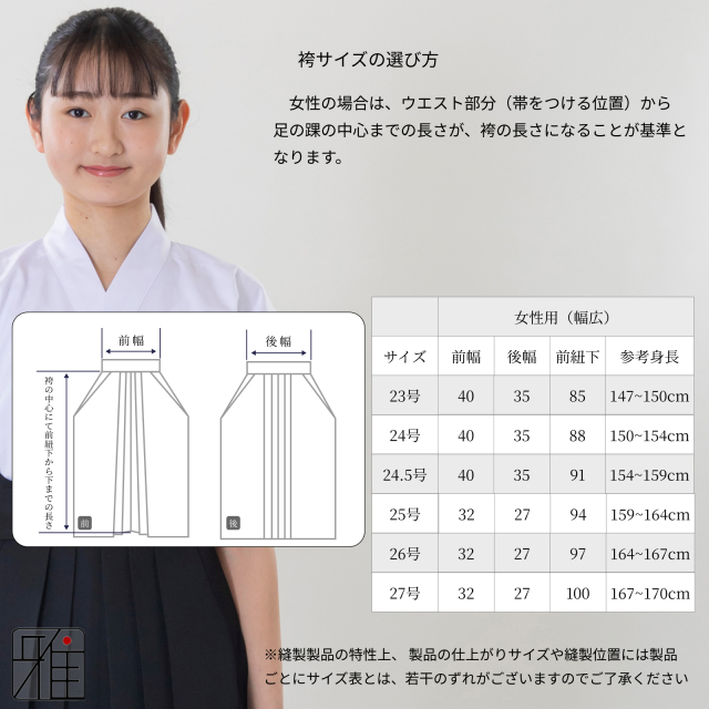TOP 上衣・袴・帯|Kyudogi Hakama Obi 上衣・袴・帯|Kyudogi Hakama Obi 女性用馬乗袴 弓道 女性用 馬乗袴 通年用 幅広 奥ヒダステッチ入|25~27号|ポリエステル 100% 価格: ¥12,100 (税込) 販売期間: 型番: 520875 数量: 枚 サイズ在庫購入25号(159~164cm)1枚 26号(164~167cm)1枚 27号(167~170cm)Sold Out サイズ在庫購入25号(159~164cm)1枚 26号(164~167cm)1枚 27号(167~170cm)Sold Out 返品・交換についての詳細はこちら レビューはありません 商品仕様 製品名: 弓道 女性用 馬乗袴 通年用 幅広 奥ヒダステッチ入|25~27号|ポリエステル 100% 型番: 520875 弓道用 馬乗袴 弓道の試合・練習用として着用されます。 弓道袴は黒または紺で、男性は馬乗袴、女性は腰板のないもので馬乗袴が好ましいと言われています。和服着用の際は、男子は縞袴が良いとされており、女性は、黒もしくは、紺色の袴が好ましいとされています。 製品名 馬乗袴 奥ヒダステッチ入 幅広 素材 ポリエステル100% 【ご購入の際の注意事項】 ※袴のサイズ(丈)は、メーカーによりサイズ表示の長さが異なりますのでご注意ください。 ※撮影時の状況(光の加減等)や、お客様のご自身のパソコン・モニター等の使用環境などにより、実際の商品と比較して色味が若干異なって見える場合もございます。予めご了承ください。 ※サイズ交換は、未使用品に限り受け付けております。 ※袴につきましては、サイズ表記の『紙テープ』 や『しつけ糸』を外してしまいますと、新品・未使用の場合であっても、返品・交換の対象外となってしまいます。 サイズをご確認の際には、必ず紙テープ・しつけ糸を外さないようお願い致します。 【商品合計による送料無料につきまして】 単品配送商品(弓・巻藁矢等)を同時にご購入の場合は、お値段に関係なく別途送料が発生する場合がございます。予めご了承ください。