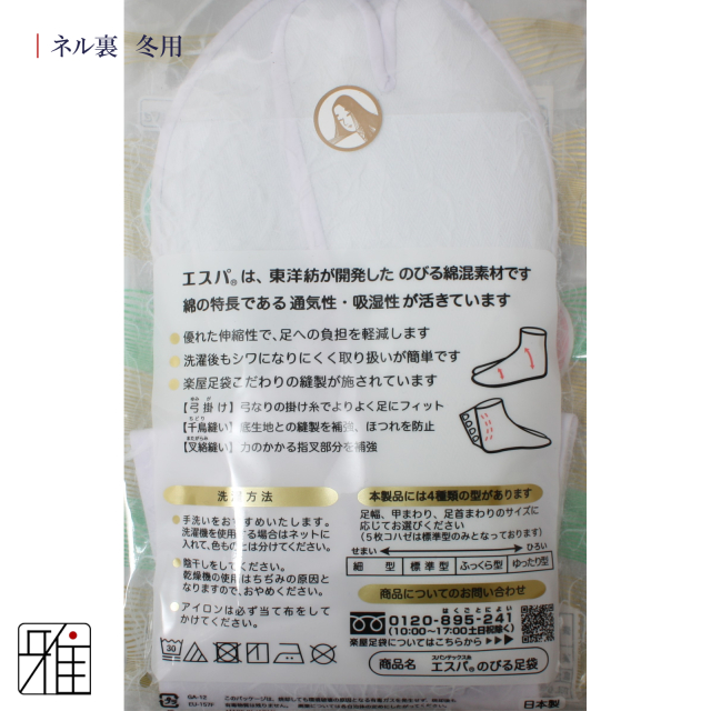 TOP 足袋・雪駄|Tabi・Setta 足袋・雪駄|Tabi・Setta冬用防寒足袋 弓道 足袋 4枚コハゼ 楽屋エスパのびる足袋 標準型 ネル裏|底地 綿100%|25~28cm【メール便可】 価格: ¥2,860 (税込) 販売期間: メーカー: 楽屋足袋 型番: 542272 数量: 足 サイズ在庫購入25.0cm10足 25.5cm10足 26.0cm8足 26.5cm10足 27.0cm7足 27.5cm8足 28.0cm8足 サイズ在庫購入25.0cm10足 25.5cm10足 26.0cm8足 26.5cm10足 27.0cm7足 27.5cm8足 28.0cm8足 返品・交換についての詳細はこちら レビューはありません 商品仕様 製品名: 弓道 足袋 4枚コハゼ 楽屋エスパのびる足袋 標準型 ネル裏 |翠山弓具店suizan kyugu 型番: 542272 メーカー: 楽屋足袋 ◆弓道 足袋 弓道で使う際は、足袋は、大変汚れやすいです。審査・大会等の前に新品の足袋をご用意ください。 ◆楽屋 エスパのびる足袋 標準型 「ネル裏」 -東洋紡が開発した伸びる綿素材「エスパ」使用- 「エスパ」は、東洋紡が開発したのびる綿混素材です。綿の特徴である通気性・吸湿性が活きています。 ・優れた伸縮性で、足への負担を軽減します。・洗濯後もシワになりにくく取扱いが簡単です。 ・底が綿100%・ネル裏タイプなので、冬用防寒としても活躍 【商品詳細】 楽屋 エスパのびる足袋(標準型) ■仕様:4枚コハゼ(ニッケルメッキ) ■素材 表地:綿70%・ポリエステル24%・ウレタン6% 裏地:綿98%・ポリウレタン2% 底地:綿100% ■生産国:日本製 ※メール便発送可能枚数は2足までとなります。3足以上は、宅配便にて配送させていただきます。