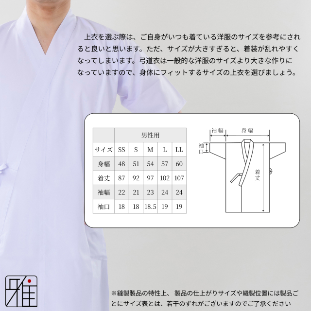 TOP 上衣・袴・帯|Kyudogi Hakama Obi 上衣・袴・帯|Kyudogi Hakama Obi 弓道衣セット 男性用 弓道衣 5点セット 『夏用』(上衣・袴・角帯・足袋・風呂敷)WEB限定 価格: ¥16,720 (税込) 販売期間: 型番: 590934 上衣サイズ: 選択してください SS S M L LL 袴サイズ: 選択してください 22号(159~163cm) 23号(163~167cm) 24号(167~170cm) 24.5号(170~174cm) 25号(174~177cm) 26号(177~180cm) 27号(180~183cm) 帯色: 選択してください 黒色 濃紺 白色 グレー さくら むらさき 茶色 足袋サイズ: 選択してください 22.0cm 22.5cm 23.0cm 23.5cm 24.0cm 24.5cm 25.0cm 25.5cm 26.0cm 26.5cm 27.0cm 27.5cm 28.0cm 大風呂敷: 選択してください 紺色 無地 数量: セット 在庫: Sold Out 在庫 Sold Out 上衣サイズ袴サイズSS22号(159~163cm)23号(163~167cm)24号(167~170cm)24.5号(170~174cm)25号(174~177cm)26号(177~180cm)27号(180~183cm)S22号(159~163cm)23号(163~167cm)24号(167~170cm)24.5号(170~174cm)25号(174~177cm)26号(177~180cm)27号(180~183cm)M22号(159~163cm)23号(163~167cm)24号(167~170cm)24.5号(170~174cm)25号(174~177cm)26号(177~180cm)27号(180~183cm)L22号(159~163cm)23号(163~167cm)24号(167~170cm)24.5号(170~174cm)25号(174~177cm)26号(177~180cm)27号(180~183cm)LL22号(159~163cm)23号(163~167cm)24号(167~170cm)24.5号(170~174cm)25号(174~177cm)26号(177~180cm)27号(180~183cm) 返品・交換についての詳細はこちら レビューはありません 商品仕様 製品名: 男性弓道衣5点セット(上衣・袴・角帯・足袋・風呂敷)WEB限定 型番: 590934 |初心者向け夏用セット内訳 弓道入門、必須弓道具、絶対に必須な弓道衣をお買い得しやすいセット商品にてご提案いたします。 ■夏用吸汗速乾上衣(ポリエステル100%) ■夏用薄手馬乗黒袴(ポリエステル100%) ■博多角帯献上柄(綿100%) ■テトロンブロード足袋4枚コハゼ(表地:ポリエステル65%・綿35%/裏地・底地:綿100%) ■風呂敷(綿100%) |上衣:SS~LLサイズ 初めて、弓道用上衣を選ぶ際は、実際にご自身がいつも着ている洋服のサイズを参考に されると良いと思います。 弓道衣は一般的な洋服のサイズより大きな作りになっていますので、身体にフィットするサイズの上衣を選びましょう。 ※縫製製品の特性上、 製品の仕上がりサイズや縫製位置には製品ごとにサイズ表とは若干のずれがございます。 予めご了承ください。 |馬乗袴:22号~27号 弓道の試合・練習用として着用されます。 弓道袴は黒色または紺色で、男性は馬乗袴、女性は腰板のないもので馬乗袴が好ましいと言われています。 | 博多角帯 献上柄:全7色 武道弓道の場合は、女性の方でも男性用の角帯を使用いたします。筋の通った縞と、独鈷柄。 博多織ならではのしゃきっとした締めごこちと空気感は、袴姿をビシっと引き締めてくれます。 裏は、もちろん、一本独鈷。無地がお好みの方は、裏側で絞めていただいてももちろん大丈夫です。 ベーシックなのに、かっこよく決まる献上帯なら、それだけで上質感があります。 ※通常3回程度巻いて使用致しますが、帯本体が長すぎる場合には、端を切ってお客様にて調整をお願い致します。 |足袋:22.0~28.0cm 表生地として綿65%ポリエステル35%、裏底生地は、綿100%のオールマイティ足袋。 綿ポリエステルを採用することで、丈夫で綿100%比べて縮みにくい足袋です。 ※優美足袋(足袋カバー)との相性も良いので重ねて履かれることをおすすめします。 ※セット商品のため、単品での返品は受け付けておりません。 ※サイズ交換は、未使用品に限り受け付けております。 ※上衣・足袋につきましては、一度ご使用になられた場合返品・交換不可となります。 ※袴につきましては、サイズ表記の『紙テープ』 や『しつけ糸』を外されますと、 新品・未使用の場合であっても、 返品・交換の対象外となってしまいます。 サイズをご確認の際には、必ず紙テープ・しつけ糸を外さないようお願い致します。 ※こちらの商品は、suizan雅オンラインショップ限定商品です。実店舗での販売はしておりません。予めご了承ください。