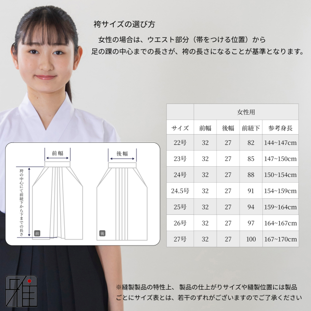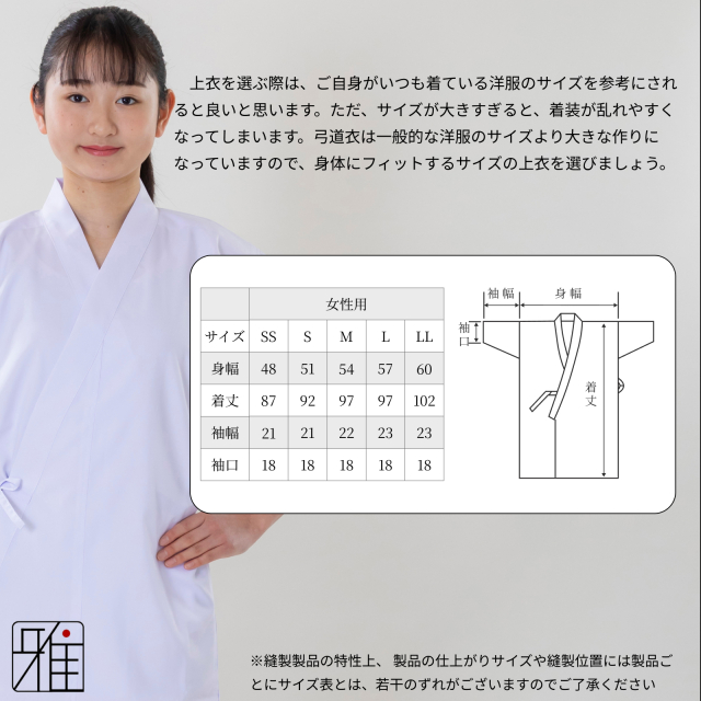 TOP 上衣・袴・帯|Kyudogi Hakama Obi 上衣・袴・帯|Kyudogi Hakama Obi 弓道衣セット 女性用 弓道衣 6点セット 『夏用』(上衣・袴・角帯・足袋・胸当て・風呂敷)WEB限定 価格: ¥17,380 (税込) 販売期間: 型番: 590935 夏用上衣サイズ: 選択してください SS S M L LL 夏用袴サイズ: 選択してください 22号(144~147cm) 23号(147~150cm) 24号(150~154cm) 24.5号(154~159cm) 25号(159~164cm) 26号(164~167cm) 27号(167~170cm) 帯色: 選択してください 黒色 濃紺 白色 グレー さくら むらさき 茶色 足袋サイズ: 選択してください 22.0cm 22.5cm 23.0cm 23.5cm 24.0cm 24.5cm 25.0cm 25.5cm 26.0cm 26.5cm 27.0cm 27.5cm 28.0cm 胸当て: 選択してください 合皮レザー黒色Sサイズ 合皮レザー黒色Mサイズ 合皮レザー白色Sサイズ 合皮レザー白色Mサイズ メッシュ白色Sサイズ+(¥220) メッシュ白色Mサイズ+(¥220) メッシュ黒色Sサイズ+(¥220) メッシュ黒色Mサイズ+(¥220) 大風呂敷: 選択してください 紺色 無地 数量: セット 在庫: Sold Out 在庫 Sold Out 夏用上衣サイズ夏用袴サイズSS22号(144~147cm)23号(147~150cm)24号(150~154cm)24.5号(154~159cm)25号(159~164cm)26号(164~167cm)27号(167~170cm)S22号(144~147cm)23号(147~150cm)24号(150~154cm)24.5号(154~159cm)25号(159~164cm)26号(164~167cm)27号(167~170cm)M22号(144~147cm)23号(147~150cm)24号(150~154cm)24.5号(154~159cm)25号(159~164cm)26号(164~167cm)27号(167~170cm)L22号(144~147cm)23号(147~150cm)24号(150~154cm)24.5号(154~159cm)25号(159~164cm)26号(164~167cm)27号(167~170cm)LL22号(144~147cm)23号(147~150cm)24号(150~154cm)24.5号(154~159cm)25号(159~164cm)26号(164~167cm)27号(167~170cm) 返品・交換についての詳細はこちら レビューはありません 商品仕様 製品名: 女性弓道衣6点セット(上衣・袴・角帯・足袋・胸当て・風呂敷)WEB限定 型番: 590935 |初心者向け夏用セット内訳 弓道入門、必須弓道具、絶対に必須な弓道衣をお買い得しやすいセット商品にてご提案いたします。 ■夏用吸汗速乾上衣(ポリエステル100%) ■夏用薄手馬乗黒袴(ポリエステル100%) ■博多角帯献上柄(綿100%) ■テトロンブロード足袋4枚コハゼ(表地:ポリエステル65%・綿35%/裏地・底地:綿100%) ■風呂敷(綿100%) ■胸あて(綿紐タイプ) |上衣:SS~LLサイズ 初めて、弓道用上衣を選ぶ際は、実際にご自身がいつも着ている洋服のサイズを参考に されると良いと思います。 弓道衣は一般的な洋服のサイズより大きな作りになっていますので、身体にフィットするサイズの上衣を選びましょう。 ※縫製製品の特性上、 製品の仕上がりサイズや縫製位置には製品ごとにサイズ表とは若干のずれがございます。 予めご了承ください。 |馬乗袴:22号~27号 弓道の試合・練習用として着用されます。 弓道袴は黒色または紺色で、男性は馬乗袴、女性は腰板のないもので馬乗袴が好ましいと言われています。 | 博多角帯 献上柄:全7色 武道弓道の場合は、女性の方でも男性用の角帯を使用いたします。筋の通った縞と、独鈷柄。 博多織ならではのしゃきっとした締めごこちと空気感は、袴姿をビシっと引き締めてくれます。 裏は、もちろん、一本独鈷。無地がお好みの方は、裏側で絞めていただいてももちろん大丈夫です。 ベーシックなのに、かっこよく決まる献上帯なら、それだけで上質感があります。※通常3回程度巻いて使用致しますが、帯本体が長すぎる場合には、端を切ってお客様にて調整をお願い致します。 |足袋:22.0~28.0cm 表生地として綿65%ポリエステル35%、裏底生地は、綿100%のオールマイティ足袋。 綿ポリエステルを採用することで、丈夫で綿100%比べて縮みにくい足袋です。 ※優美足袋(足袋カバー)との相性も良いので重ねて履かれることをおすすめします。 |胸あて:綿紐タイプ 弓道で使用される道具になります。離れの際に弦が胸を擦る事を防止する役割があります。 【胸あての紐について】 ゴム製の紐が一般的には使われておりますが、装着した際に身体へフィット感が弱く、締まりが悪いため、使用される方によっては、弓道の動作の上で弦が胸あてに引っかかるなど安全性が確保できないため当店では、綿紐を採用しており身体にフィット感がでるように変更しております。 ※セット商品のため、単品での返品は受け付けておりません。 ※サイズ交換は、未使用品に限り受け付けております。 ※上衣・足袋につきましては、一度ご使用になられた場合返品・交換不可となります。 ※袴につきましては、サイズ表記の『紙テープ』 や『しつけ糸』を外されますと、 新品・未使用の場合であっても、 返品・交換の対象外となってしまいます。 サイズをご確認の際には、必ず紙テープ・しつけ糸を外さないようお願い致します。 ※こちらの商品は、suizan雅オンラインショップ限定商品です。実店舗での販売はしておりません。予めご了承ください。